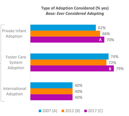 Among those who haven’t adopted, one-quarter have ever considered it, on par with 2012 numbers. Among potential adopters, consideration of foster care adoption has increased significantly since 2012. Source: The Dave Thomas Foundation for Adoption, 2017 U.S. Adoption Attitudes Survey.