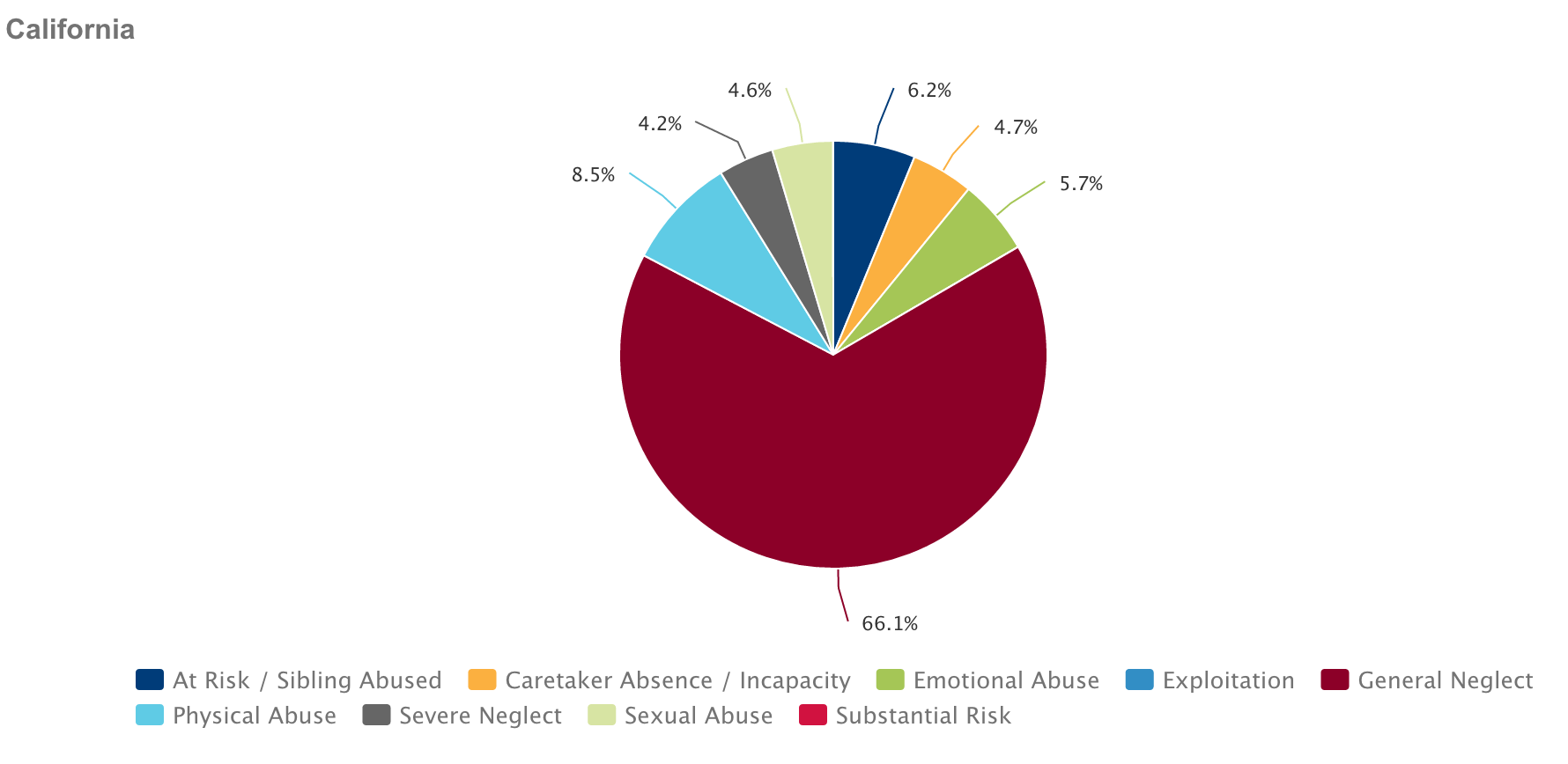 Verified cases of abuse and neglect by type. Definition: Percentage of substantiated cases of child abuse and neglect for children under age 18, by type of abuse (e.g., 8.5% of substantiated cases of child abuse and neglect in California in 2014 were for physical abuse). Data Source: Webster, D., et al. California Child Welfare Indicators Project Reports, UC Berkeley Center for Social Services Research (May 2015). Footnote: A child is counted only once (per year, per county), in the category considered most severe. For more information on ‘Substantial Risk,’ please visit: http://www.dss.cahwnet.gov/lettersnotices/entres/getinfo/acl07/PDF/07-52.pdf. LNE (Low Number Event) refers to data that have been suppressed because there were fewer than 180 total cases. Image: Kidsdata.org