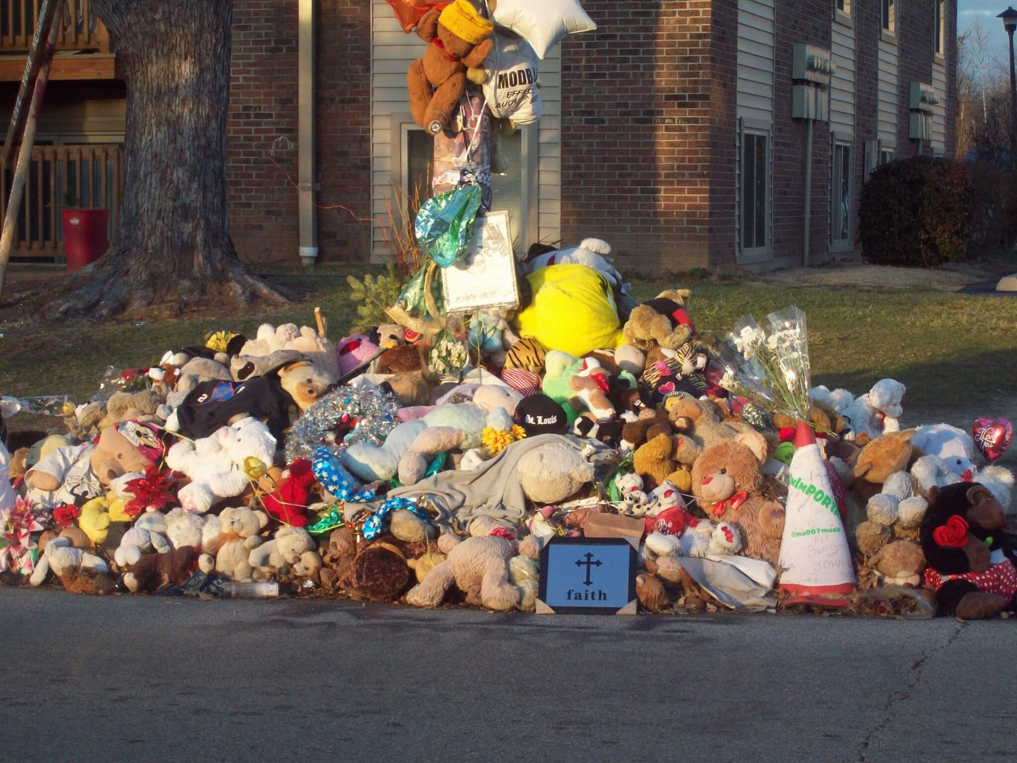 I park inside Brown’s apartment complex and walk into a cluster of young men with stony faces guarding the makeshift memorial created by residents. My stomach is in knots as I ask one of them, a brawny dark-skinned guy with shoulder-length dreadlocks, if I can take photos of the site.