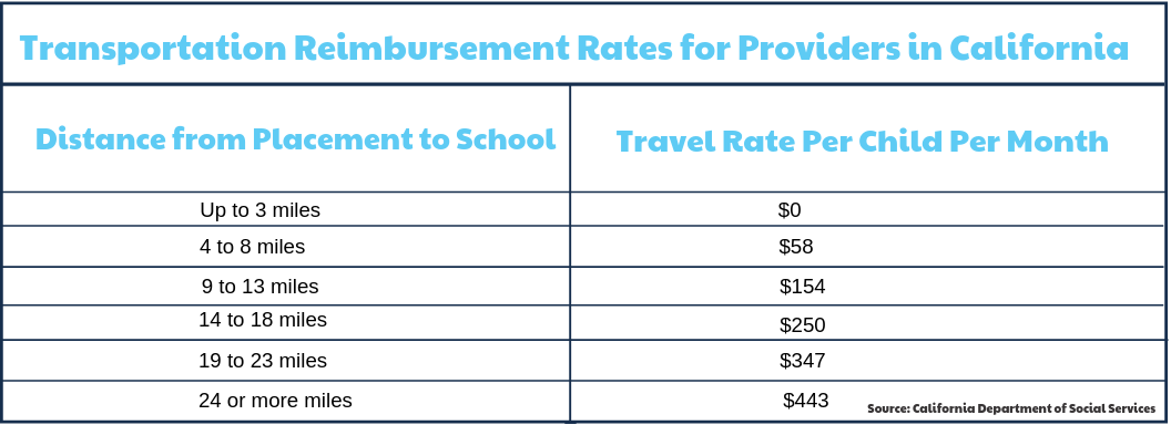 Under the Fostering Connections to Success and Increasing Adoptions Act of 2008, the federal government specified that foster care payments should include the cost of “reasonable travel” required to maintain a youth in their school of origin and prevent unnecessary school changes. Caregivers in California can receive up to $443 in monthly support to transport a foster child to their school of origin, depending on how far they live from the school.