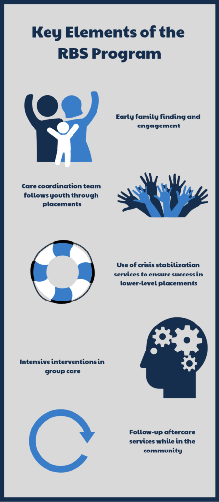 Under RBS, children received one plan of care, supported by a child-and-family team that helped make decisions. That plan had several defining characteristics: a coordinated care team to follow a child from residential into community placements; ongoing crisis stabilization resources for the family receiving a child; family search and engagement support that started the first day a child entered group care; and six months of aftercare for the child and family.