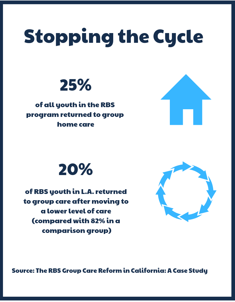 In 2014, an evaluation funded by Casey Family Programs revealed the results of the RBS project. Youth who participated averaged one fewer placement than other youth, and in L.A., only 20 percent returned to group care after their experience, compared with more than 80 percent of a control group.