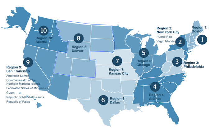 The Administration for Children and Families operates 10 regional offices that provide assistance to groups of states. Image courtesy of Department of Health and Human Services.
