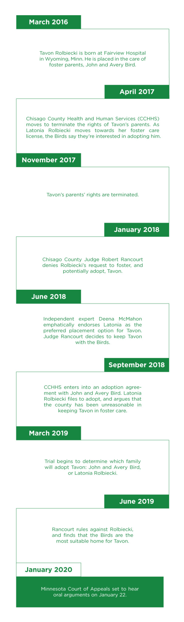 Rancourt ruled that Tavon should be adopted by the Birds. He lauded Latonia Rolbiecki’s “commitment and involvement in this process and her desire to do what is in Tavon’s best interests.” But he said that even if he agreed that Chisago County Health and Human Services was culpable, Tavon was better off with the Birds.