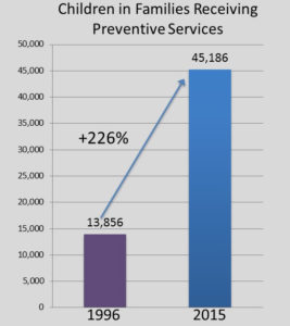The effort is consistent with the city’s general trend of reducing entries into foster care, and reinvesting in prevention services. From 1996 to 2015, ACS has seen a reduction in overall foster care numbers from nearly 42,000 to less than 10,000. Over the same span, the number of children receiving “preventive services” in a family has jumped 226 percent.