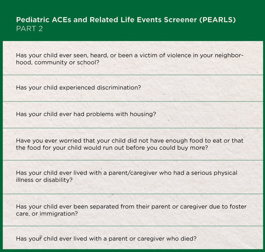 Unlike other 10-question ACEs tools, PEARLS includes seven additional questions, including whether children have experienced violence in their neighborhood, community or school — everything from bullying to war and terrorism. It asks whether children have endured discrimination, eviction, foreclosure, foster care or homelessness. Parents are asked whether they’ve ever run out of food or been separated from their children due to immigration policies. Depending on the total number of ACEs, patients are categorized as low, intermediate or high risk for toxic stress.
