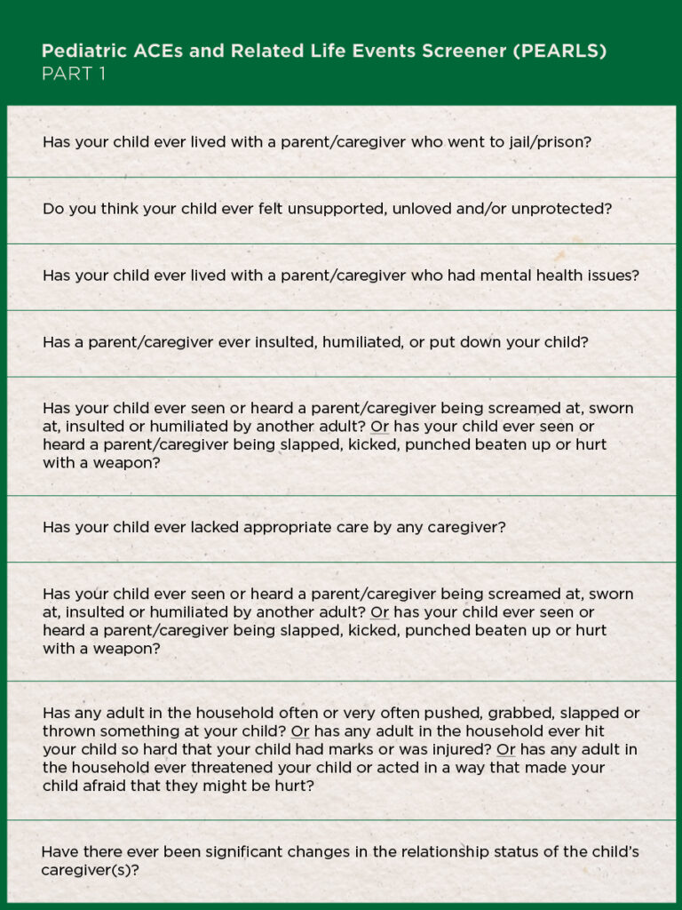 Has your child ever lived with a parent or caregiver who went to jail or prison? Has your child’s parent or caregiver ever had depression, schizophrenia, bipolar disorder or anxiety? Have caregivers struggled with too much alcohol, street drugs or prescription meds? Has any adult in the household ever hit your child so hard that it left marks? Has anyone had oral, anal or vaginal sex with your child?