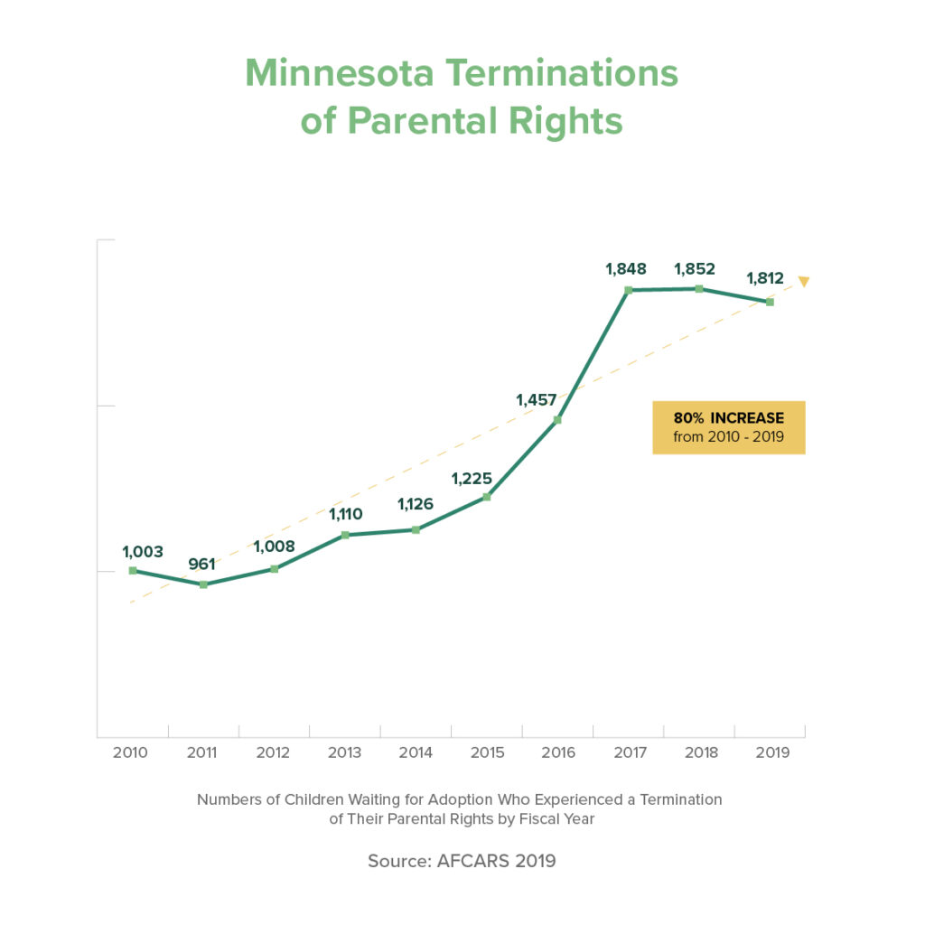 The two children now before the Hennepin County court are not being named by The Imprint to protect their identities and the precarious nature of their fate. Approximately 70,000 kids per year are awaiting adoption after having been permanently separated from their parents. That number has risen in recent years – from 62,230 in fiscal year 2015 to 71,335 in fiscal year 2019, the most recent stats available.