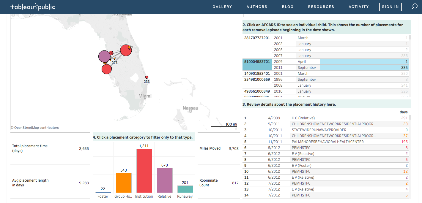 This month, Latham went live with one of the most compelling presentations of child welfare data ever conceived. He mapped the placement paths for every child in foster care since 2002, and then produced a public website through which anyone can visualize the path of a single youth through the system.