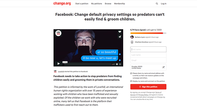 The Change.org campaign, #ProtectChildrenByDefault, was launched on June 18 with an almost two-minute video calling out flaws in Facebook’s default privacy settings for minors that make them vulnerable to predators.