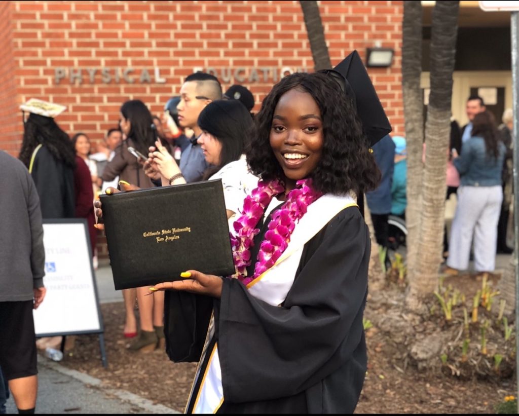 Promise Sunday at her Cal State LA graduation last month. She earned a bachelor’s degree in social work and will soon begin a paid internship with the LA Youth Network. Photo credit: Promise Sunday