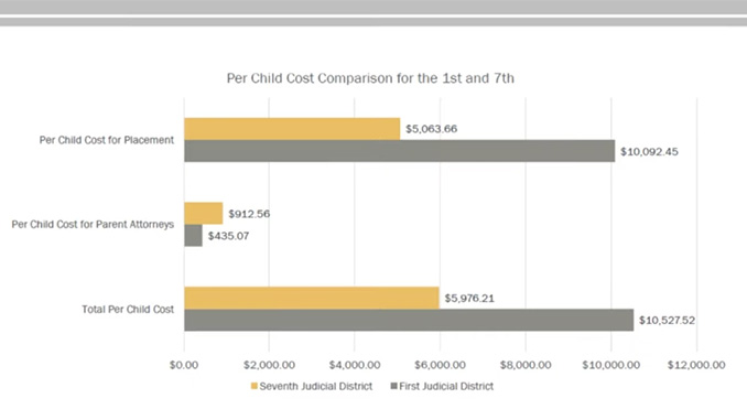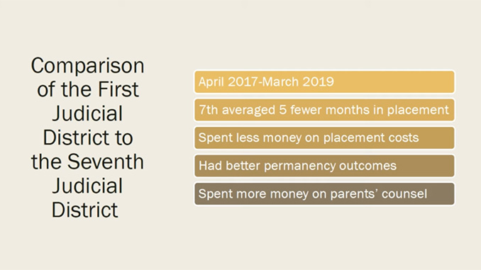 She went on to compare costs and permanency data from two Wyoming counties – Natrona with a strong parent representation model with five experienced attorneys on contract and Laramie County with just one attorney contracted to represent parents. Analyzing data from April 2017 to March 2019, Laramie County with 553 foster cases spent $10,092 per child for placement while Natrona County with 656 children, spent $5,064 per child for placement. The length of stay in those counties also differed drastically with a nine-month average for Laramie County and just four months for Natrona County’s strong parent defense support system.