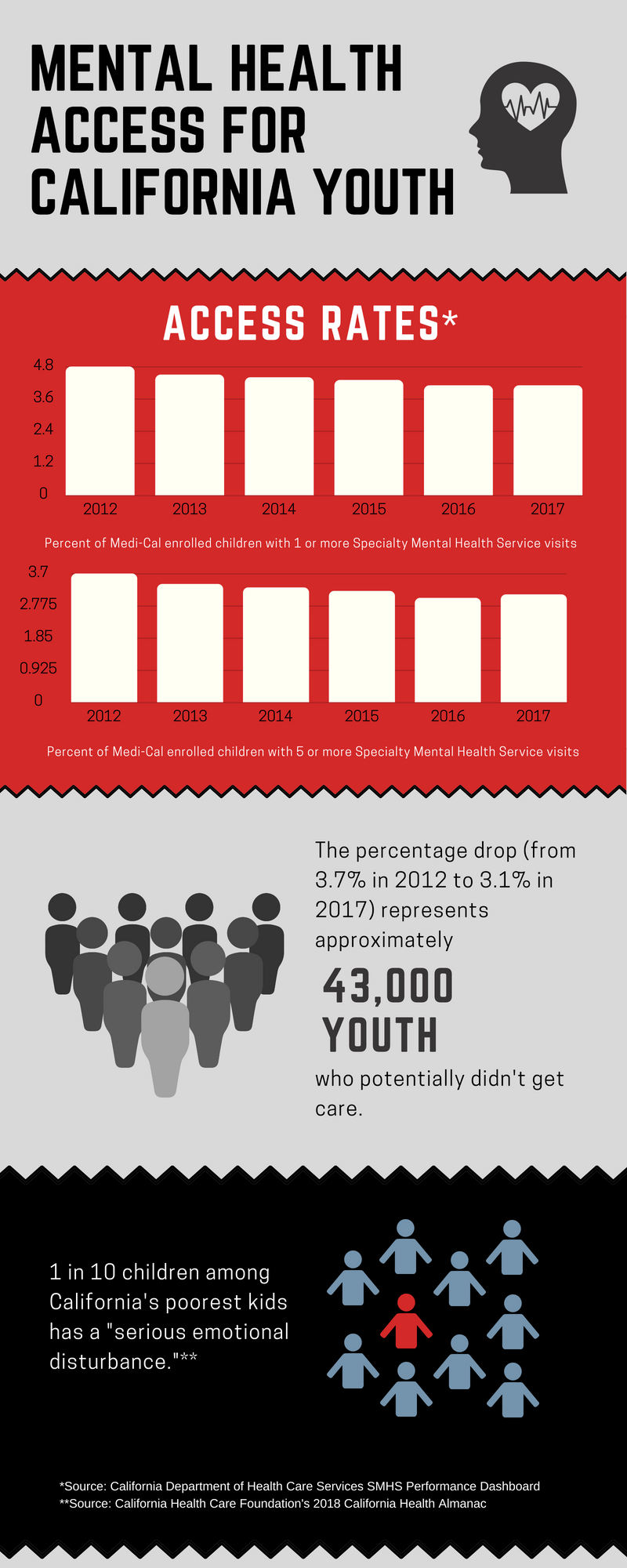 DHCS tracks two types of access rates: those counting youth who had at least one contact with the SMHS system in a given year, and those who had five or more contacts or “visits.”