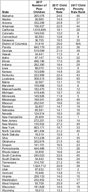Child poverty varies widely by state. New Hampshire posted the lowest child poverty rate in 2017 (10.3 percent), according to estimates by the Children’s Defense Fund. Louisiana, ranked last, posted a rate of 28 percent that year.