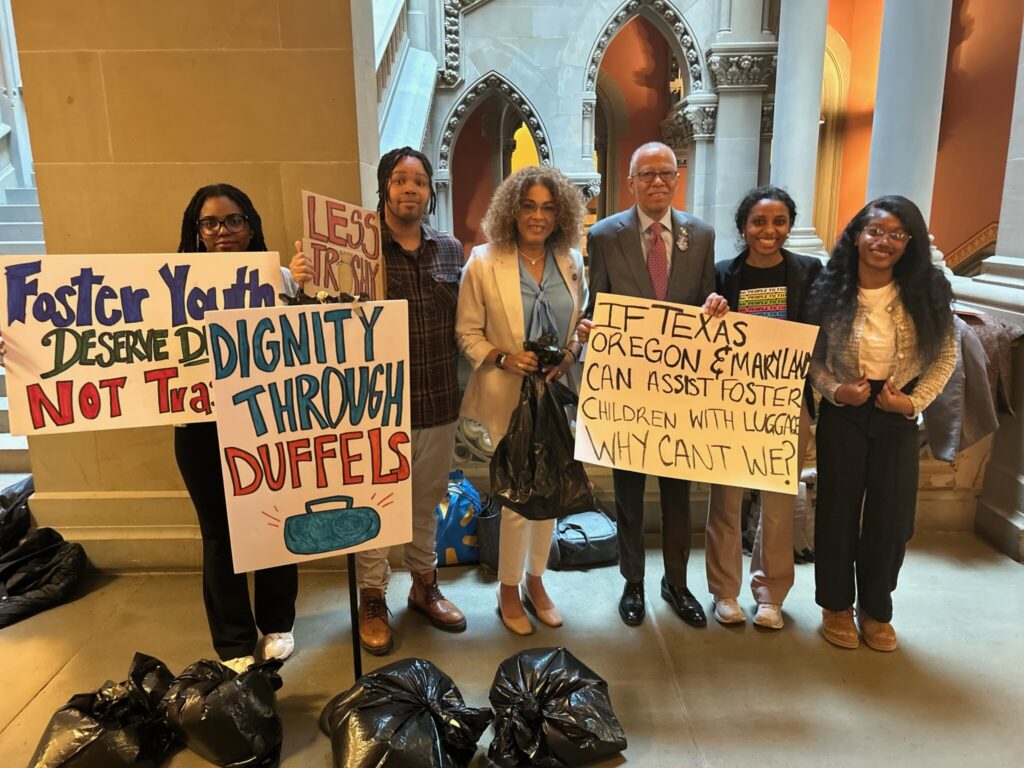 Former foster youth joined lawmakers for a rally on the steps of the state Capitol this week after a New York bill that sought to end the practice of giving foster youth trash bags to transport their belongings failed to make it onto the Legislature’s budget proposals for the coming fiscal year.