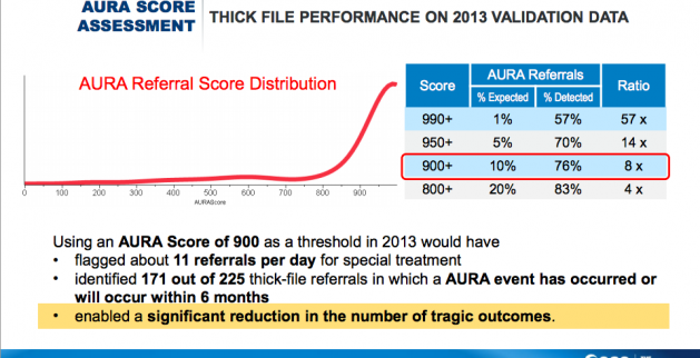 The experiment, dubbed AURA, or Approach to Understanding Risk Assessment, tracked child deaths, near fatalities and “critical incidents” in 2011 and 2012. The firm called these very rare and tragic happenings “AURA events,” and looked six months back in the histories of those children and families to find reports of abuse, which they called “AURA referrals.” Using a mix of data including, but not limited to: prior child abuse referrals, involvement with law enforcement, as well as mental health records and alcohol and substance abuse history, SAS statisticians created a risk score from one to 1,000, wherein high numbers demark high risk.