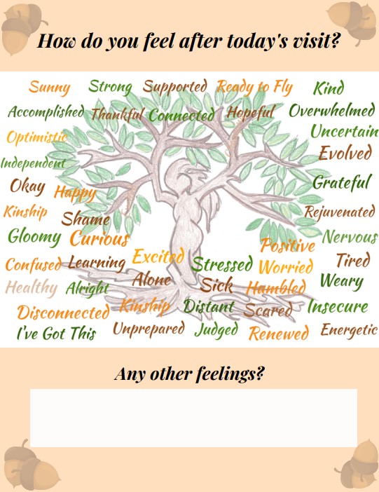 The document features a giant tree in the shape of a woman’s form, with deep roots beneath her feet and powerful branches for limbs. Around the tree are words for parents to pick from that span the emotional spectrum: Alone. Shame. Uncertain. Supported. Grateful. Rejuvenated. Positive. Stressed. Parents circle four or five primary emotions they are experiencing.