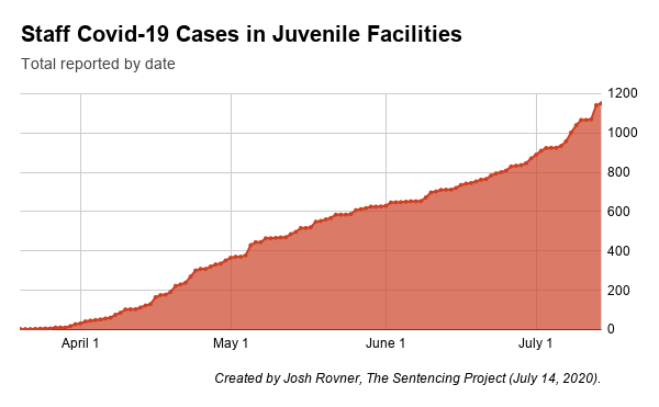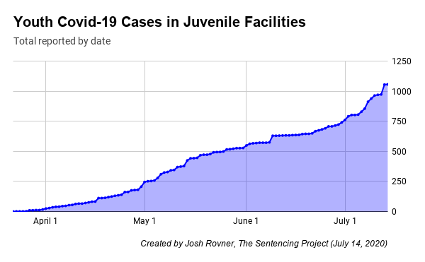 Rovner said the numbers OJJDP cited were wrong at the time – the agency used a lower total than was true upon release of the memo on May 29 – and the total has definitely escalated in the weeks since Memorial Day weekend. As of yesterday, Rovner has tallied 1,059 incarcerated youth and 1,151 staff with positive tests – combined, that is more confirmed cases than there are in Hawaii, Vermont, Alaska, Montana or Wyoming.