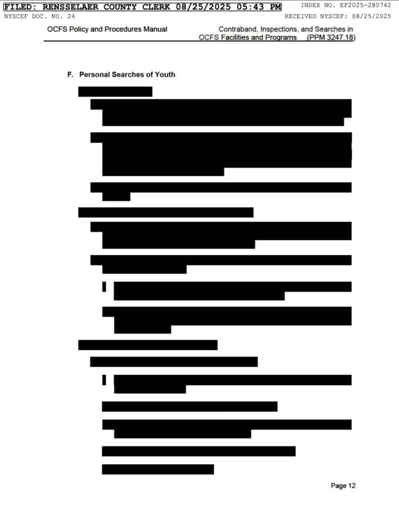 “OCFS not only denied responsive information through its broad and unjustified redactions,” the lawsuit states, “but also withheld potentially more than fifty responsive policies and procedures, with neither identification nor explanation.”