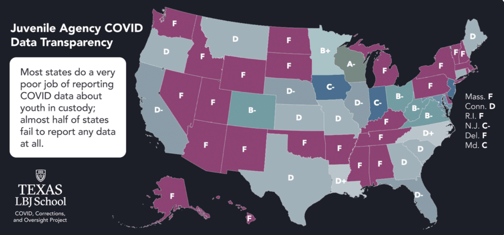Texas, Florida, California, Georgia, Louisiana, Ohio, Maryland and New Jersey, among other states, have regularly updated their websites with testing and outbreak data for juvenile facilities since the early days of the pandemic. Maryland and New Jersey announced universal testing, and by the end of last September had reported 923 and 743 tests of youth, respectively. Texas relied on universal testing at five locked facilities for 700 youth residents and 1,700 employees.