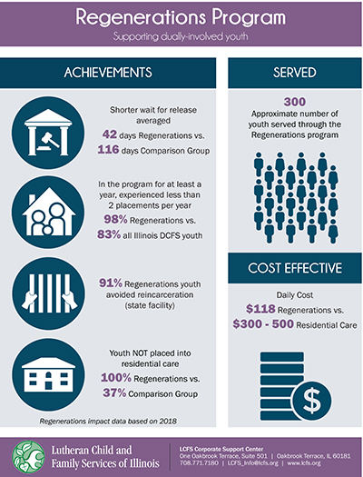 Regenerations Since its inception in 2006, nine out of 10 participants in the program have avoided re-incarceration, and all youth in Regenerations are placed outside of residential care into the homes of relatives or foster parents. Youth ages 12-22 are eligible for the program, and are provided advocacy, education, therapy and vocational training services to prevent re-offending.