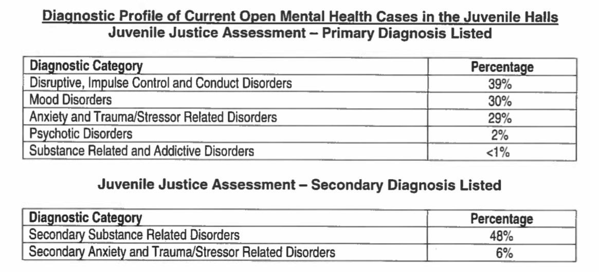 “Youth who remain detained and housed in probation facilities, particularly juvenile halls, are significantly more likely than youth from a decade ago to suffer from severe mental disorders, particularly trauma-related disorders and symptoms and substance use disorders, and therefore are more likely to receive mental health services,” the report reads.