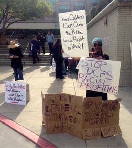 Demonstrators gathered outside the Edmund D. Edelman Children’s Court in Los Angeles today to express support for Presiding Judge Michael Nash’s 2012 blanket order easing media and public access to the County’s Juvenile Dependency Court.