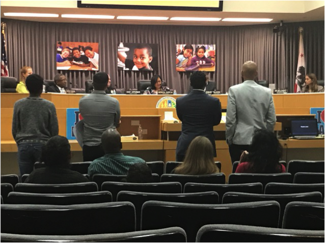 Youth leaders with the Brothers, Sons, Selves Coalition tell their stories and advocate for restorative justice at the LAUSD’s Successful School Climate Committee meeting in April.