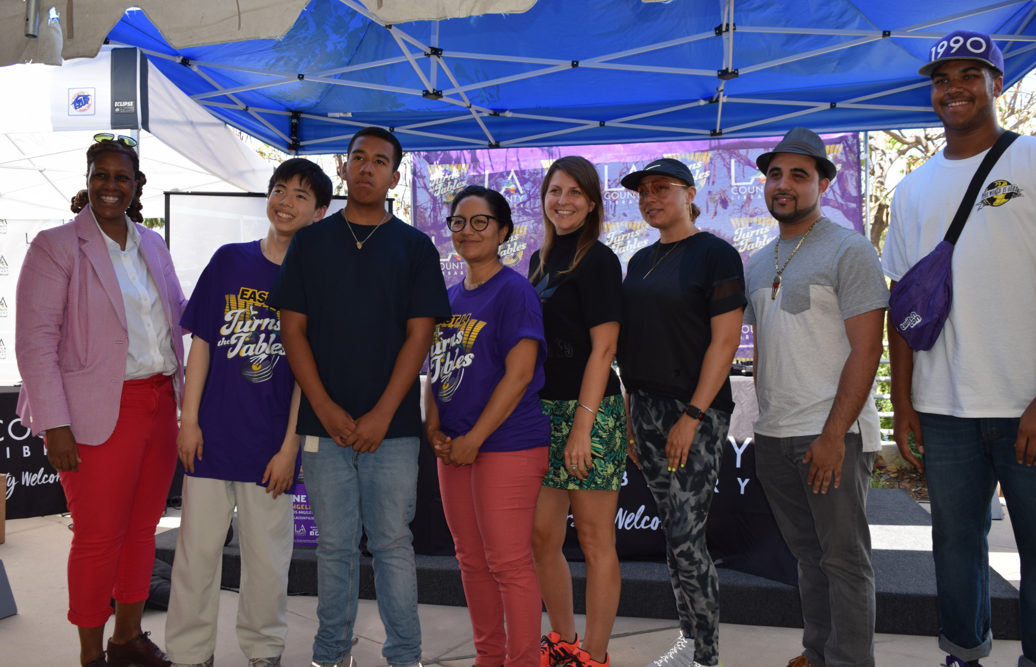 Library Director Skye Patrick (far left) with student DJs, program facilitator Moni Vargas (center, in purple), and showcase judges. Photo: Sara Tiano