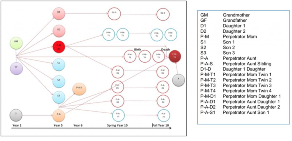 CREDIT: SAS. This diagram shows all the adults with prior child abuse reports connected to the baby who died.