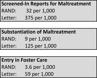 These were the inputs challenged by a group of 34 researchers focused primarily on child welfare data. They outlined to RAND in a letter that the most recent cumulative estimates were, in all three of those instances, ten times higher than the ones used for the simulation.