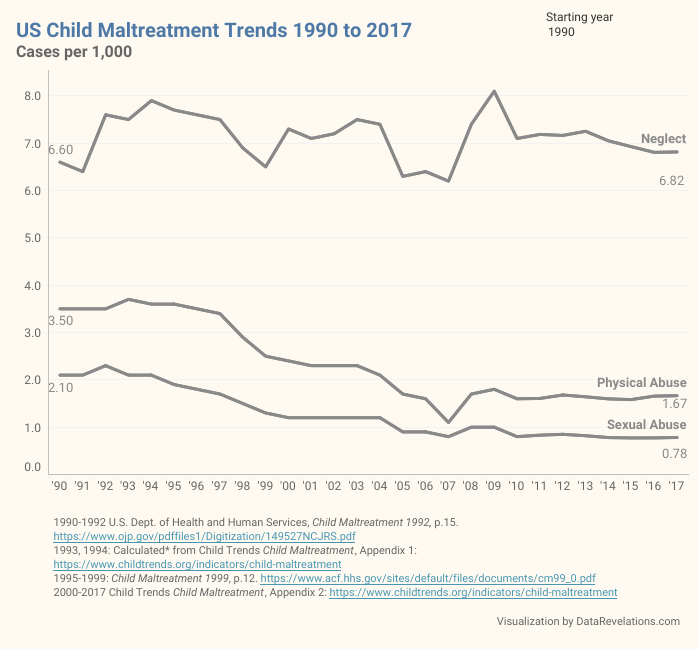 In fact, about two-thirds of the numbers are made up. Finkelhor & Co. didn’t choose the numbers at random — but the numbers still aren’t real. They decided to compare the actual rate of “substantiated” neglect to twice the actual rate for physical abuse and three times the rate of sexual abuse. Below the chart Finkelhor and his colleagues say the doubling and tripling of actual figures for physical and sexual abuse rates was done to make trends in all three categories more visible in the same chart. Chapin Hall included this when it reproduced the graphic. Prevent Child Abuse America eliminated most of this explanation, leaving only the notation “x2” and “x3” next to the numbers for physical and sexual abuse.