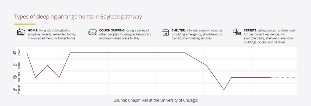 One of the youth who participated in Chapin Hall’s Voices of Youth Count (VoYC) study was 23 when he was last interviewed and had just secured a job at a retail store in the suburbs of Chicago. Facing challenges in securing housing, he was still cycling between couch surfing, staying at temporary shelters in the city, and sleeping in the stairwells that were close to his new job.