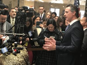 California Gov. Gavin Newsom talks to media outside his office.
