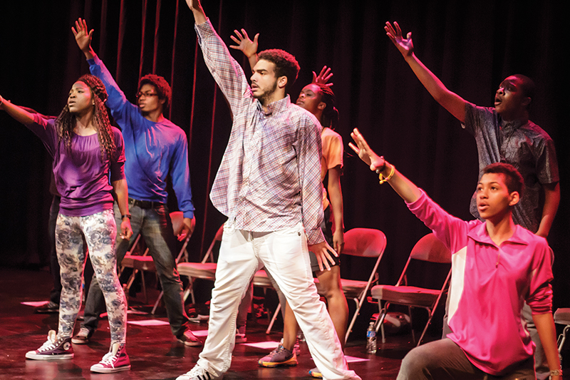 Then, roughly six to 10 of each incoming class will assume producer-style leadership roles and set policies and schedules. By month two, all the students are involved in acting, improv, dance, voice, movement, singing and playwriting classes, plus conflict resolution, leadership and diversity training, for roughly six hours per week for three months.