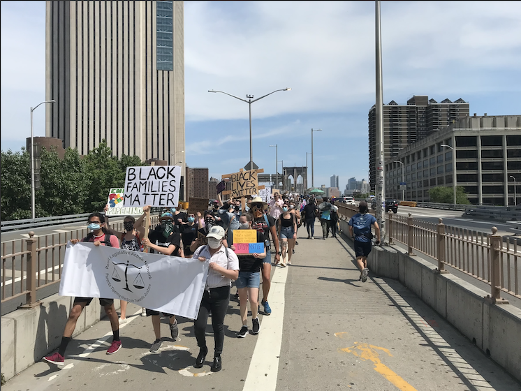 A parent-led protest against family separations by the child welfare system crossed the Brooklyn Bridge this summer. Photo: Michael Fitzgerald