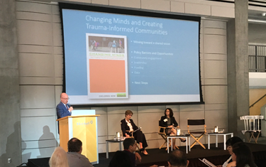 Projected on the enormous screen at the front of the room was a blue-tinged image of a brain scan with a seemingly simple phrase next to it: “Changing Minds.” The striking image and accompanying messages are still being developed by national nonprofit Futures Without Violence (Futures) for a public outreach campaign about the complex issue of childhood trauma.
