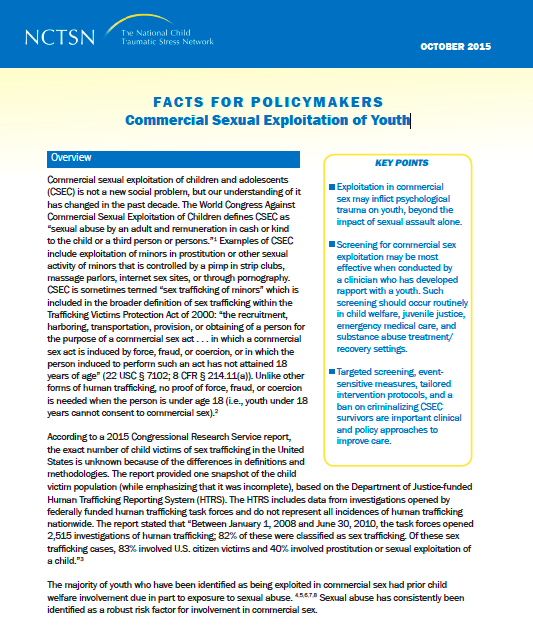 A brief from the National Child Traumatic Stress Network aims to give policymakers updated information and perspectives about the commercial sexual exploitation of children and adolescents (CSEC). Based on a recent journal article, the brief looks at current findings and offers suggestions that could improve screening and treatment protocols for exploited youth.