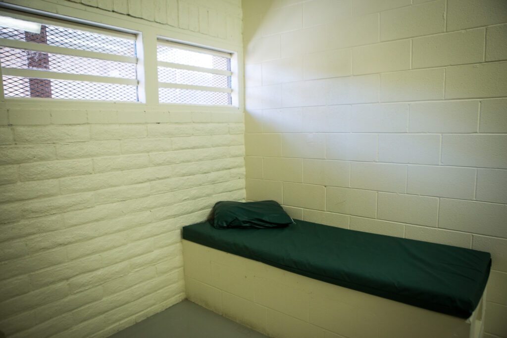 Juvenile halls vary from county to county, but typically they feature rows of reinforced steel doors that lock from the outside. Narrow windows allow youth to peer into linoleum-floored dayrooms where institutional furniture is bolted to the floor. Behind these locked doors are tiny cinder block cells where young people sleep atop cement blocks or bunks, with bare metal toilets and a metal desk, also bolted to the wall.