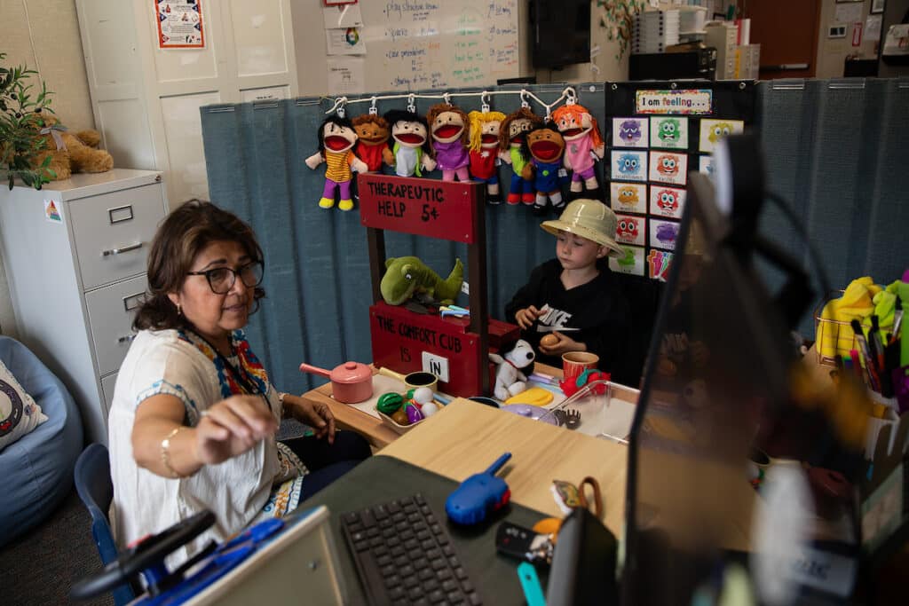 In between those one-on-one sessions, therapists lead small group sessions where they teach aspects of a program called Incredible Years that helps students learn about feelings and how they can regulate them. These sessions can involve activities such as reading books, discussing different types of feelings or using puppets to act out a scenario that may help unlock emotions.