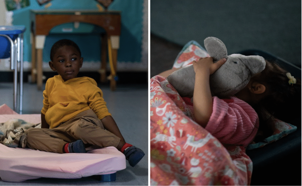 While most students quickly fell asleep, some struggled to relax. One girl refused to sleep and cried when told she couldn’t run around the classroom. Teachers tried to help by offering to read her books or by blowing small bubbles, but she wasn’t having it. Another girl lay very still with her eyes wide open looking straight at the ceiling. She barely blinked and stayed this way for most of nap time before finally dozing off.