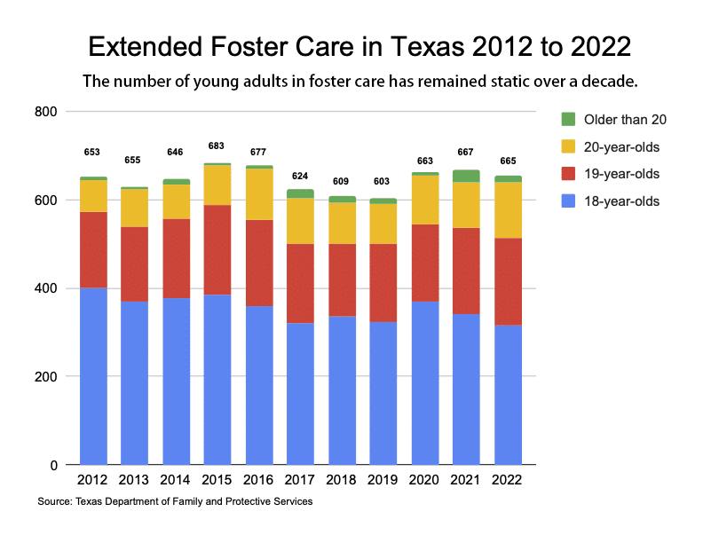 A 2022 report by the federal Housing and Urban Development found 1,226 unaccompanied homeless youth in Texas, the fourth-highest total in the country. And while there is no direct connection between that tally and a failure to house 18- to 21-year-olds who are eligible for extended foster care, studies indicate that those young adults swell the ranks of the homeless.