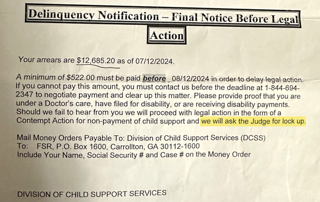 A filing in U.S. District Court asserts that “a parent with limited income cannot simultaneously pay hundreds of dollars in child-support and save money for adequate housing, food, clothing, and medical care for their children.”