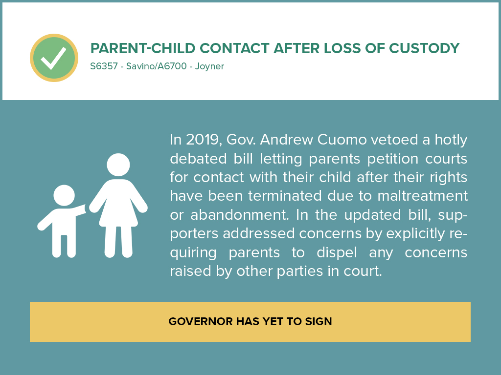 Bills passed this year would prohibit the arrest and prosecution of children younger than age 12 and disallow the shackling of kids accused of crimes in family court; allow parents to petition for the right to visit children even after their custody rights have been terminated, and allow older teenagers who have previously left foster care to receive its extended care benefits that provide for housing and financial security.