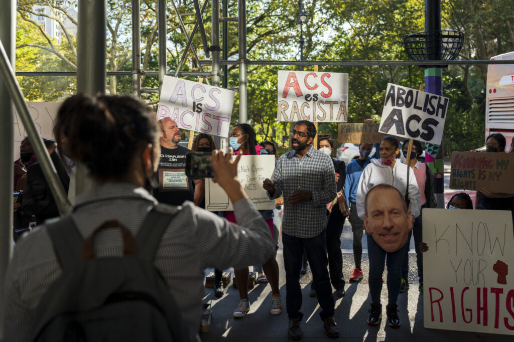 Before the day’s meetings began at both the state and city chambers, more than a dozen protesters gathered outside a state office building, chanting the names of elected officials who they say have failed to act, and waving signs reading “ABOLISH ACS” and “Do Not Open Your Door For ACS.”