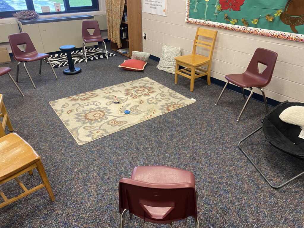 At a morning Tier I circle for second and third graders, a teacher placed a ceramic cupcake, a candle and a small plush toy on the floor for the kids to focus on if they didn’t want to make eye contact. They responded in different ways. One walked in and out of the circle and played with plastic traffic cones. Another stayed in the back of the classroom with a teacher’s aide for one-on-one support. A new student in the class kept his head down, banged his fist on the desk, and ignored most of the teacher’s questions. One boy sat with his stuffed unicorn, stroking it during his turn to speak.