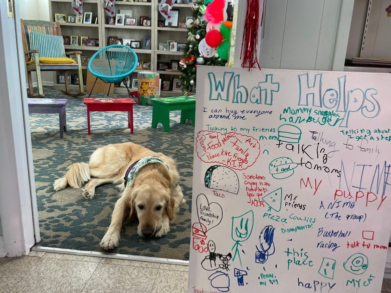 Inside, The Caring House is just as cozy, with snacks and hot chocolate in the kitchen, art supplies and toys galore, a huge stuffed Teddy bear, and a floppy-eared golden retriever named Paxton who loves hugs. The Caring House is patterned after The Dougy Center, which opened in Portland, Oregon, in 1982 and became a global model for a peer support-based grief center for children and their families.
