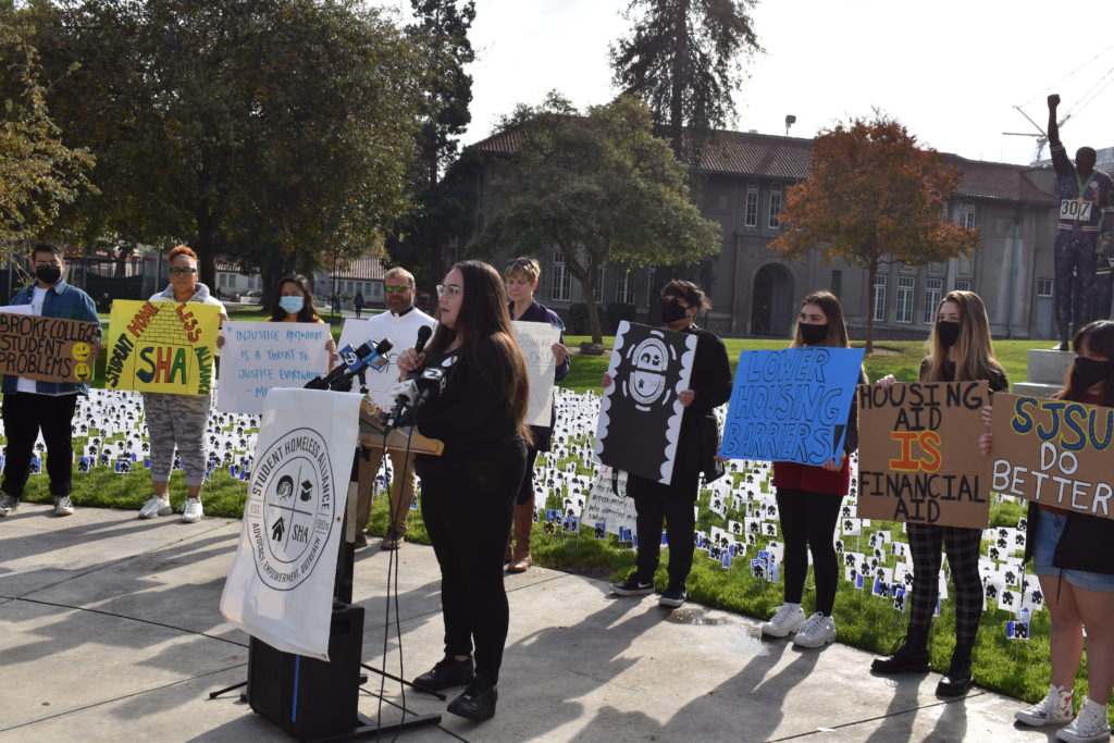 Holding signs that read, “Lower Housing Barriers” and “SJSU Do Better,” members of the Student Homeless Alliance stood shoulder to shoulder at a news conference on campus Dec. 2. An array of 4,000 white flags bearing houses arced behind them, each representing a student who experienced homelessness for at least a day during the past year.