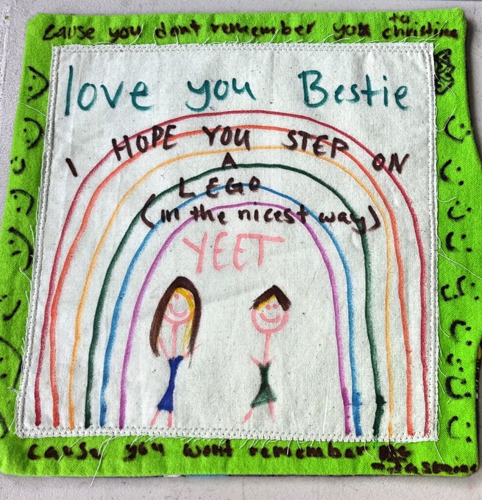 Throughout their stay, children craft keepsakes to remind them of the experience. Each makes a memory quilt or pillow for their sibling, drawing pictures in colored fabric pens or writing notes or inside jokes on the patchwork squares. They compile scrapbooks from professional photos taken at camp — both sibling portraits and candid shots of their summer shenanigans.