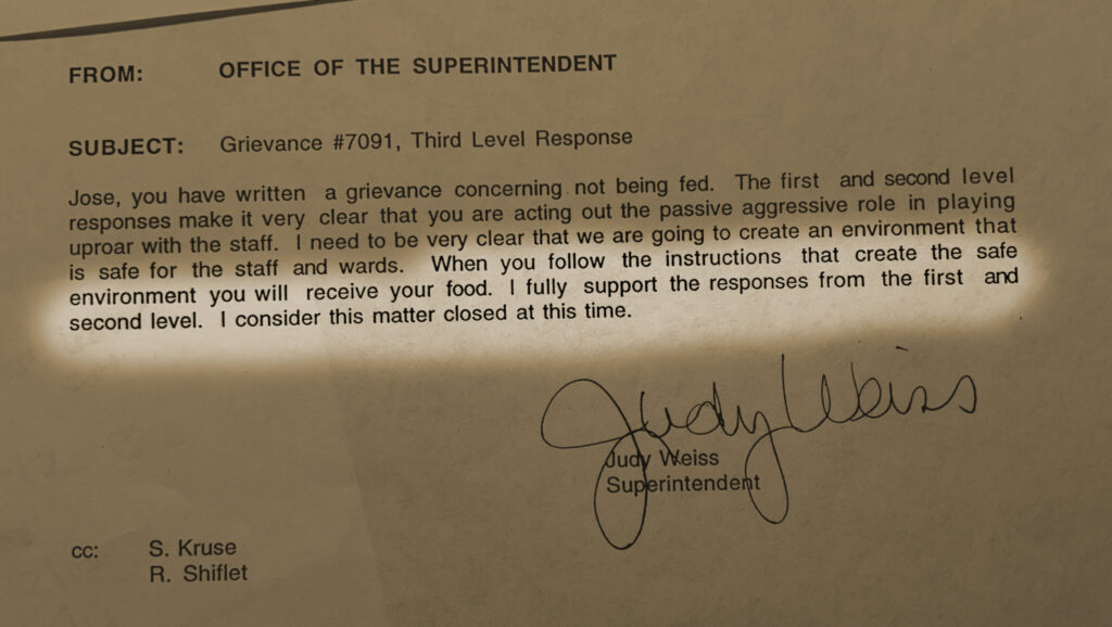 “You will not receive an investigation into the matters you have addressed,” Superintendent Judy Weiss wrote on June 28, 1999, in response to the grievance. “When you follow the instructions that create the safe environment you will receive your food.”